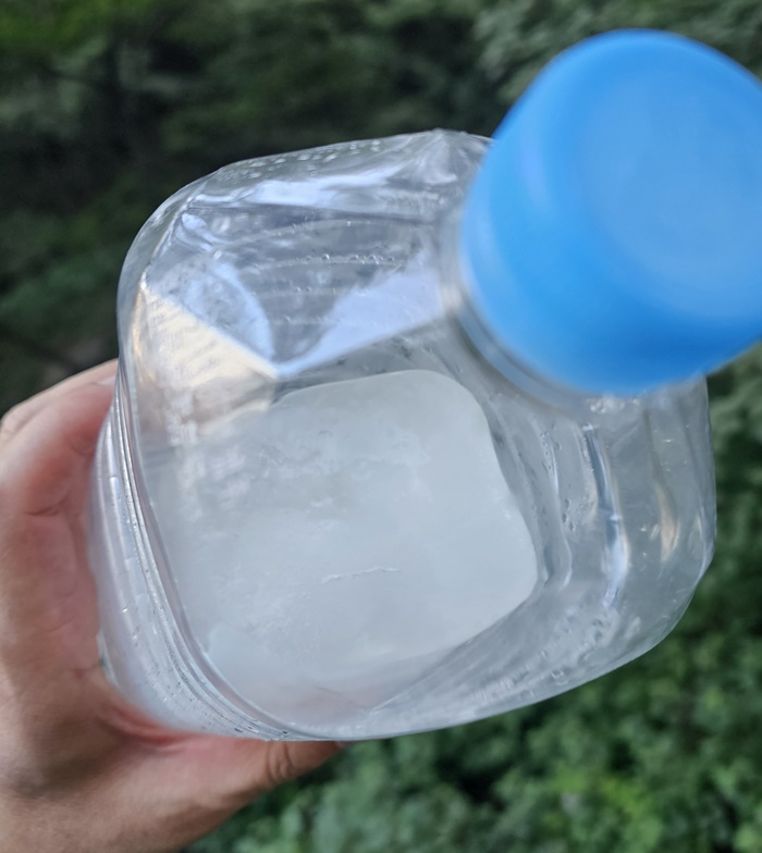 물을 꽁꽁 얼려와서(냉장고 7일) 아직도 얼음, 정상에서 강아지 주고 나니 물은 없고 얼음뿐