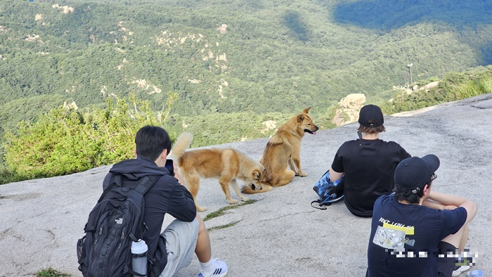 백운대 정상에 오르니 사람들 사이에 작은 두 마리 강아지가 있었습니다.