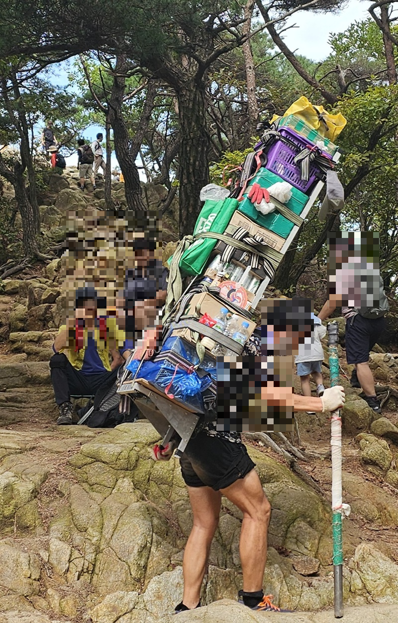 그런데 마치 히말라야의 쉐르파처럼, 지게에 몸집보다 훨씬 큰 짐을 짊어지고 산길을 내려가는 모습….