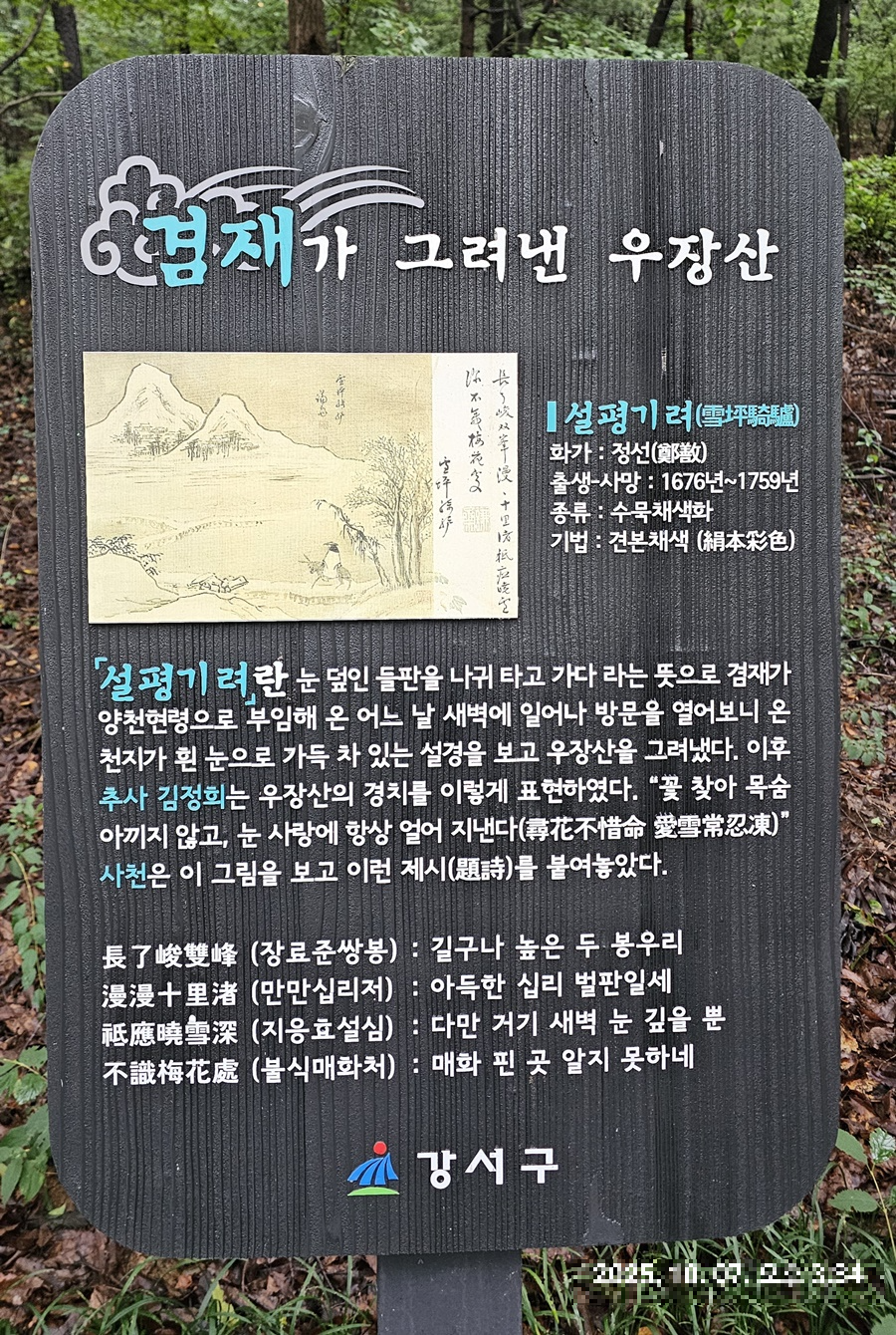 데크길 중간에 우장산 지명에 얽힌 이야기, 겸재선생님이 그려낸 우장산, 기우제와 우장이란? 안내 표지판도 참 인상 깊게 읽었습니다.