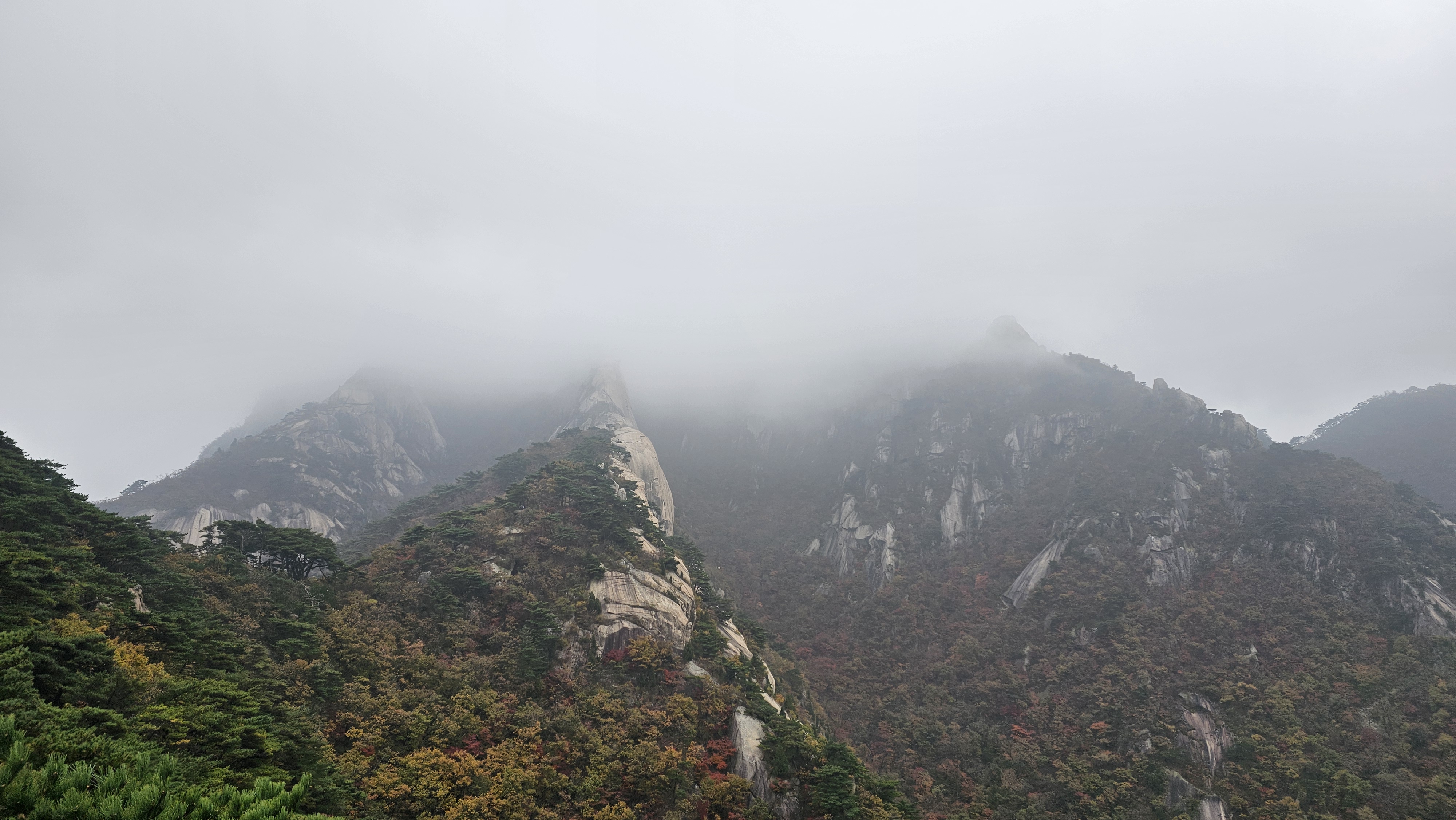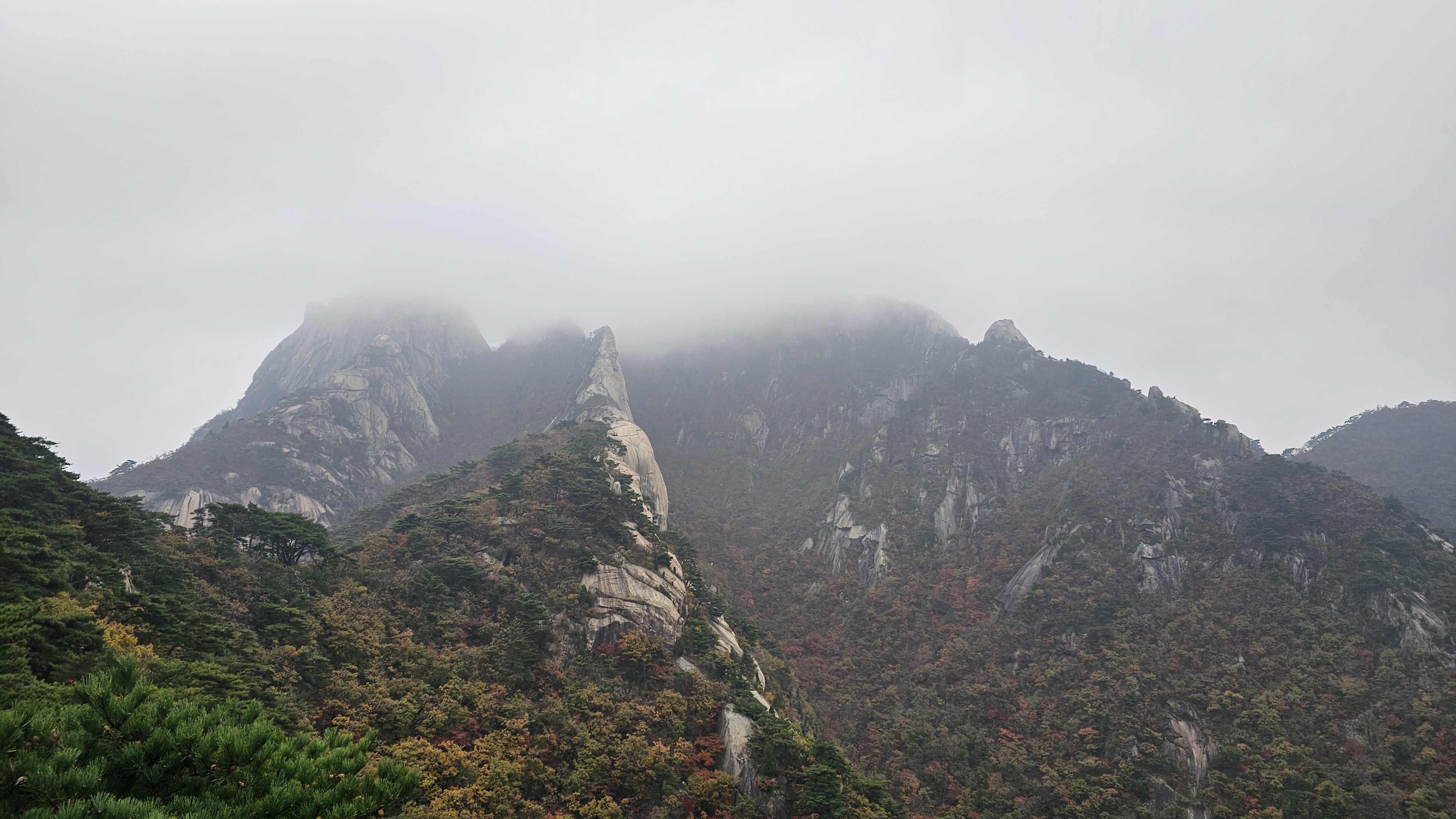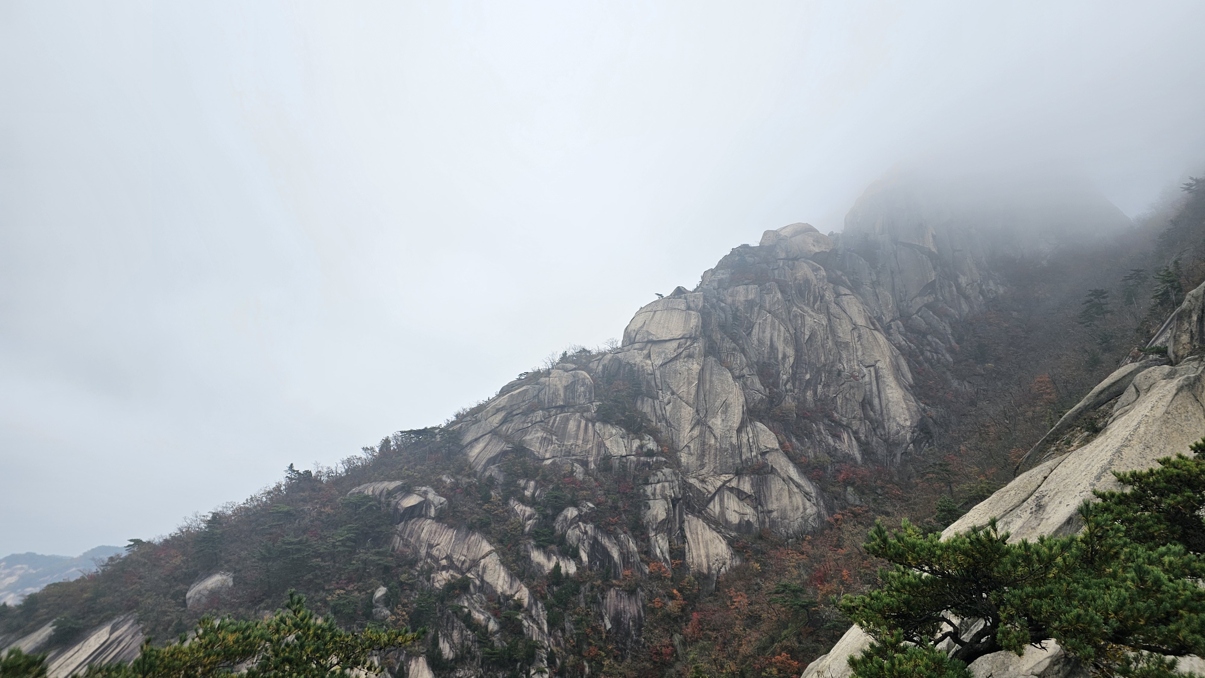 흐린 하늘 아래 붉고 노란 잎들이 안개 사이로 아련하게 비쳐서 그야말로 ‘가을 속을 걷는다’는 표현이 딱 맞았습니다.