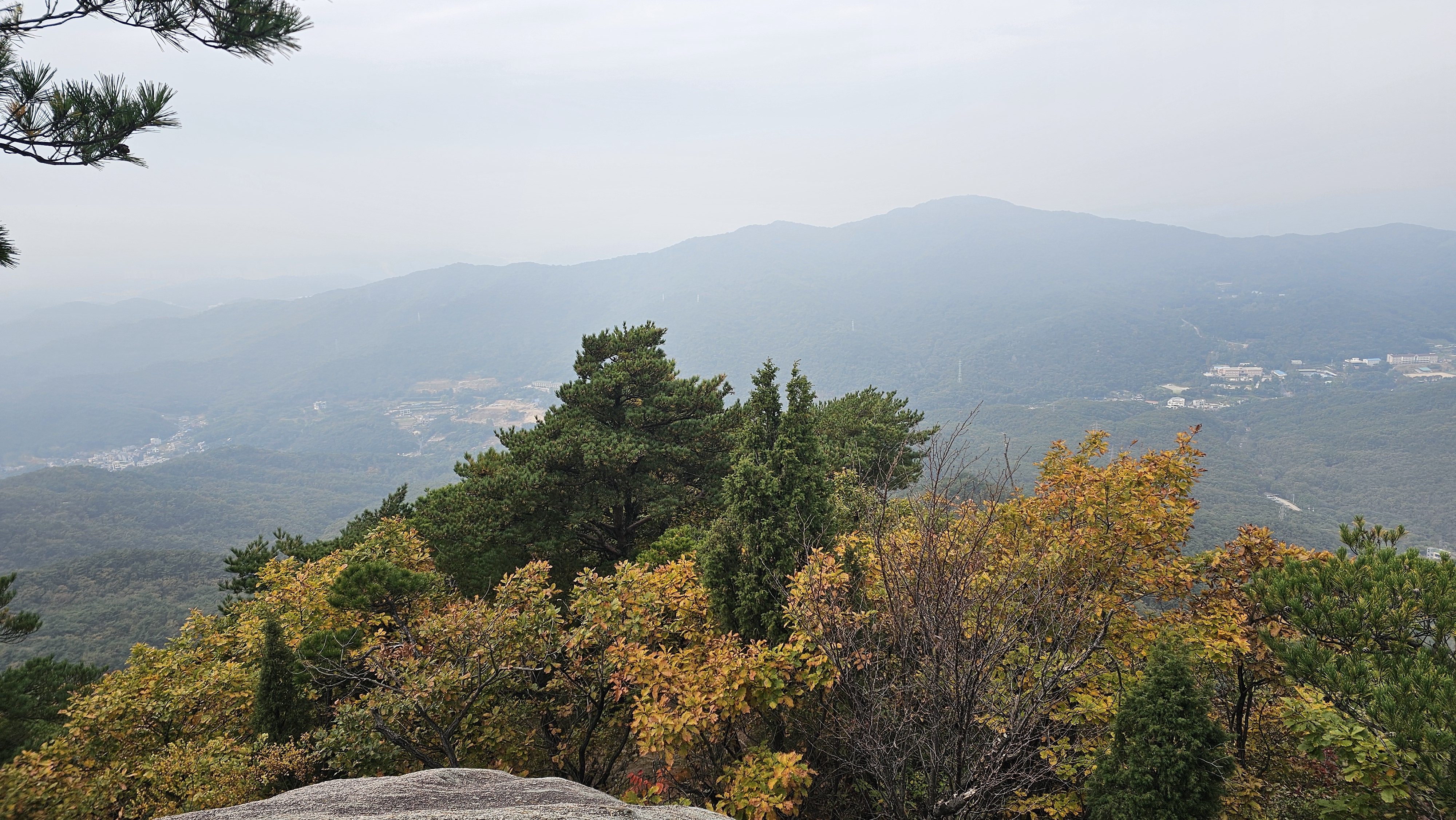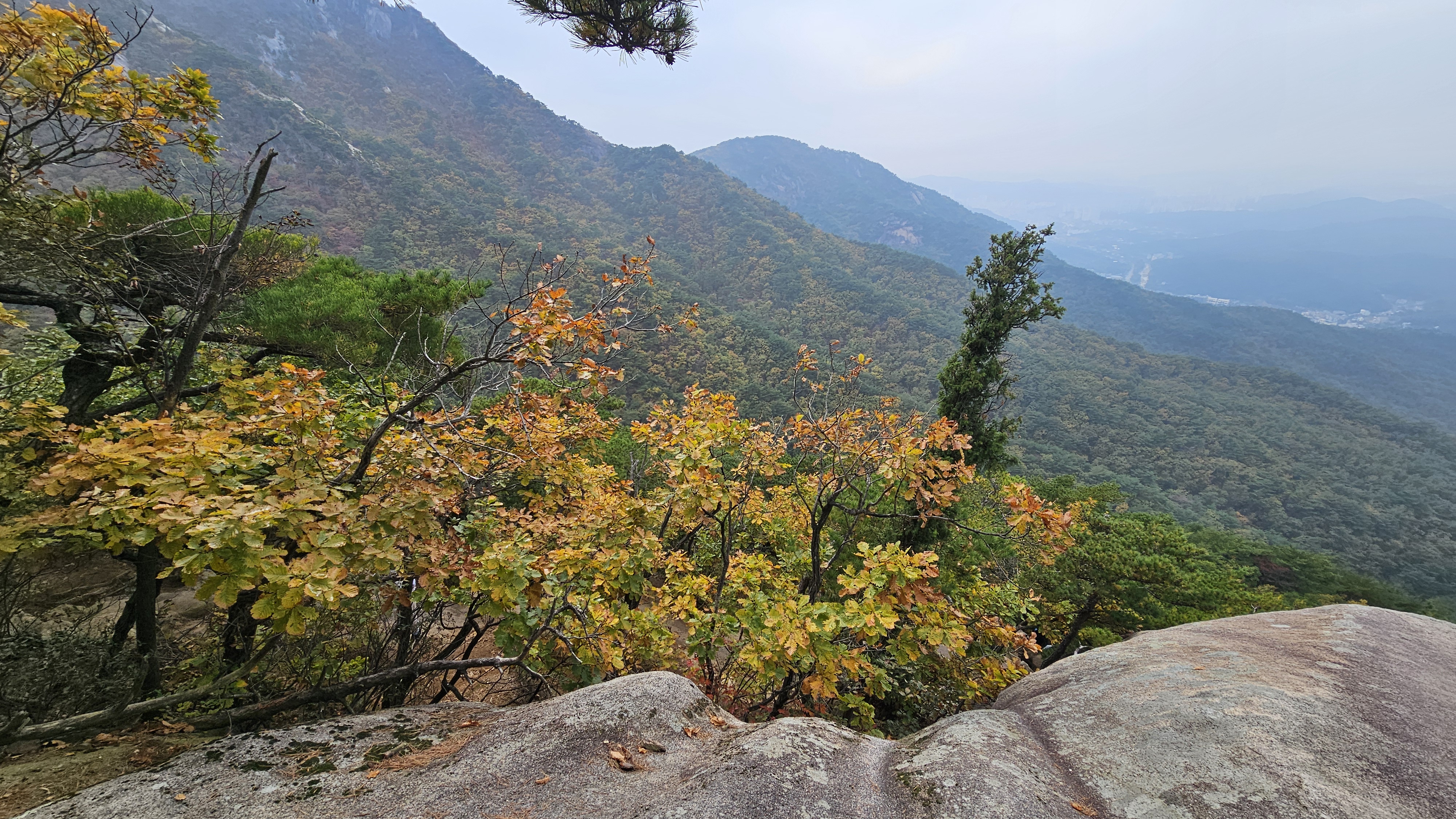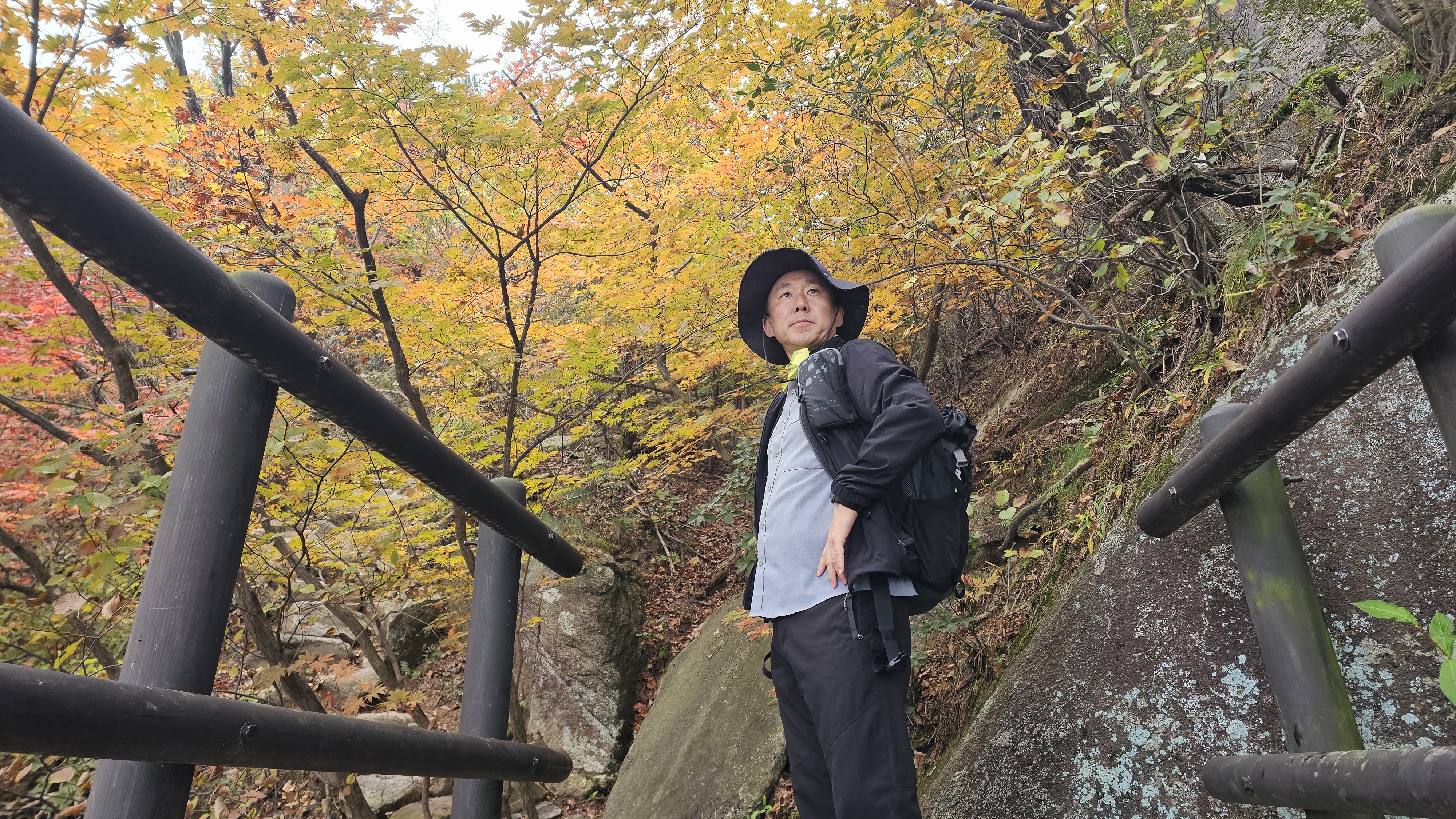 흐린 하늘 아래 붉고 노란 잎들이 안개 사이로 아련하게 비쳐서 그야말로 ‘가을 속을 걷는다’는 표현이 딱 맞았습니다.