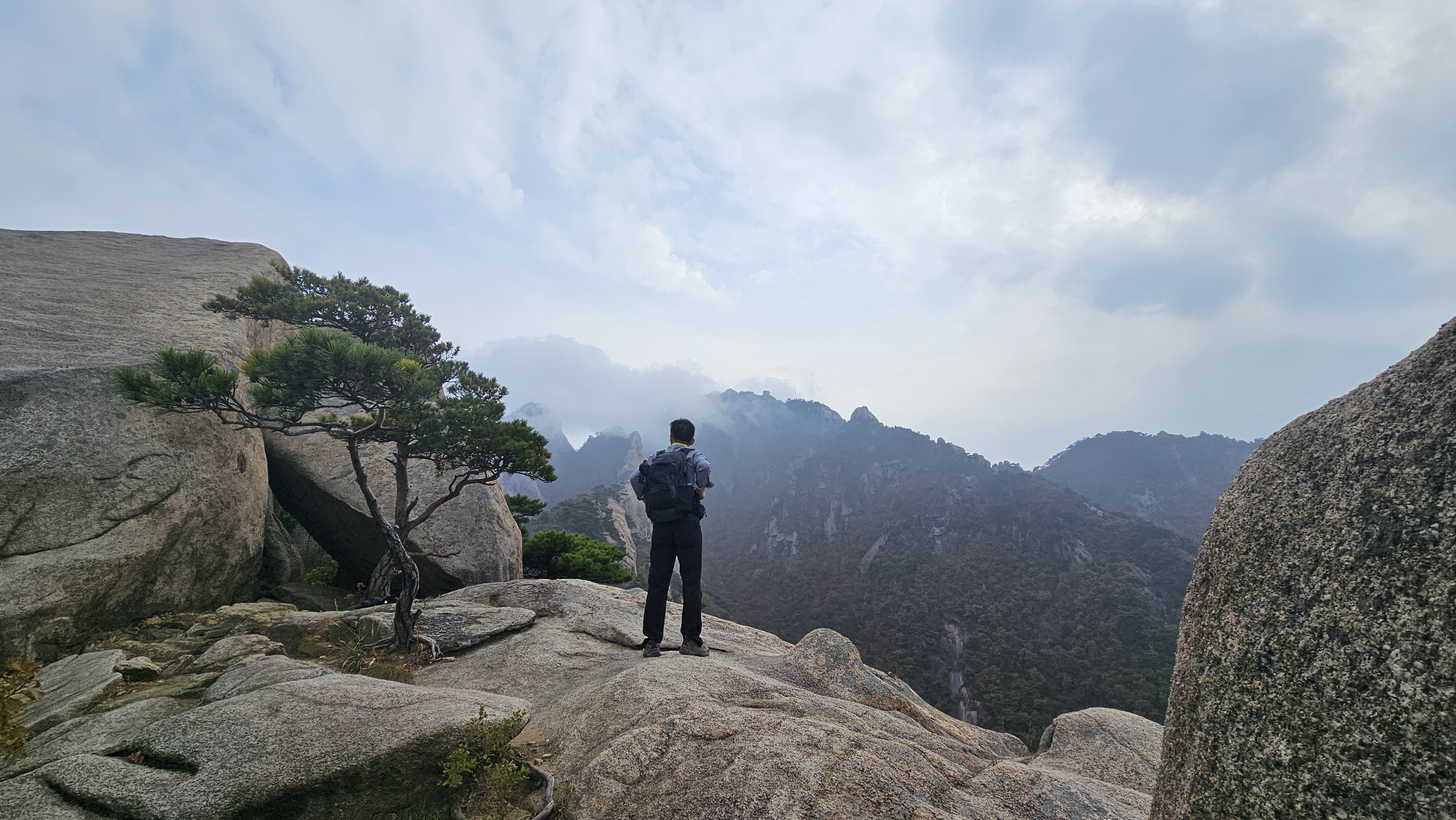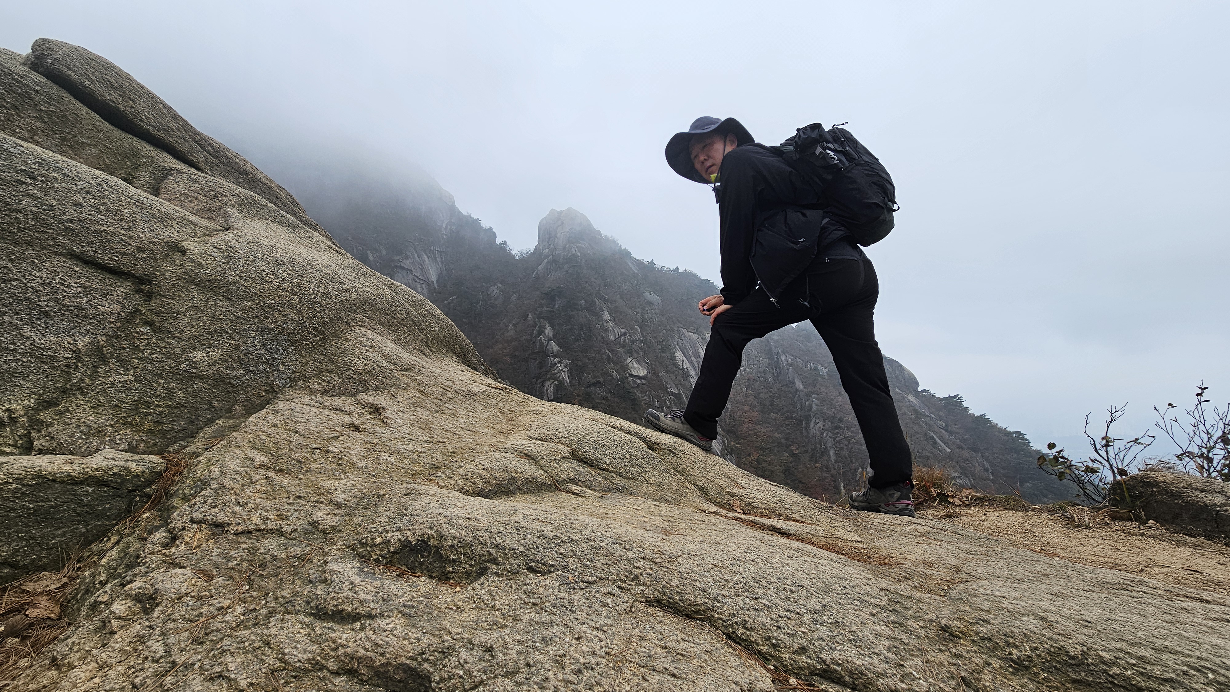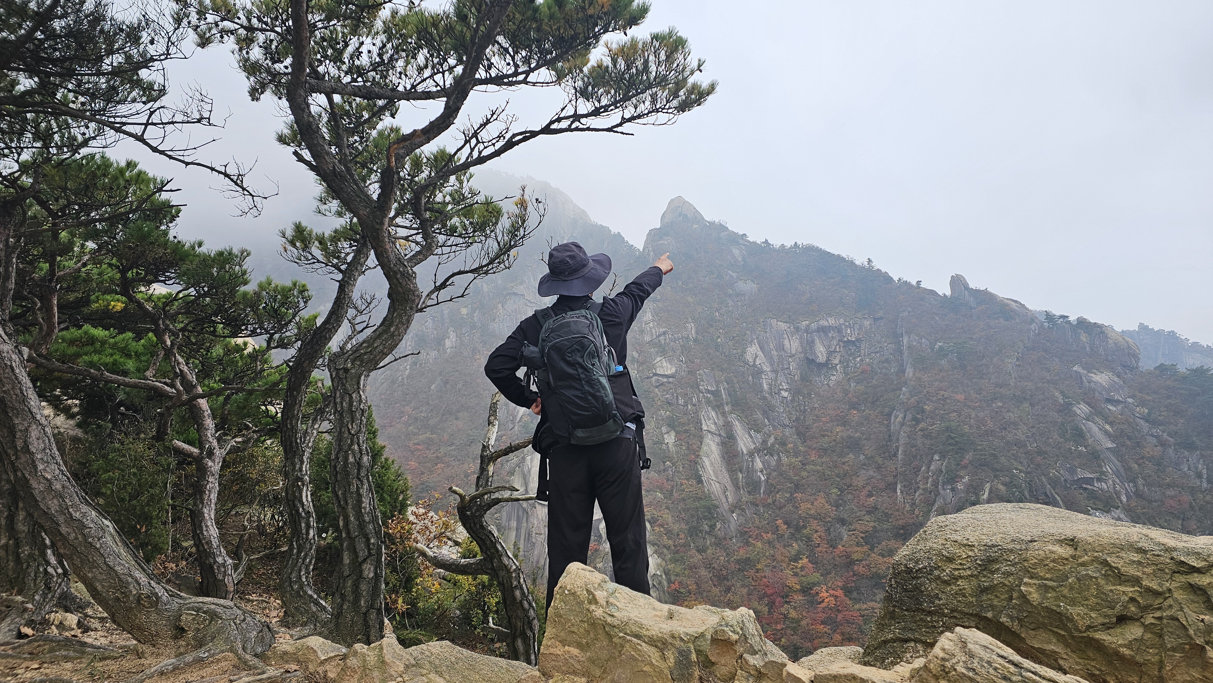 천천히 숨은벽 능선을 걸으며, 쉬며 놀며, 운무 속 웅장한 경치를 감상했습니다.