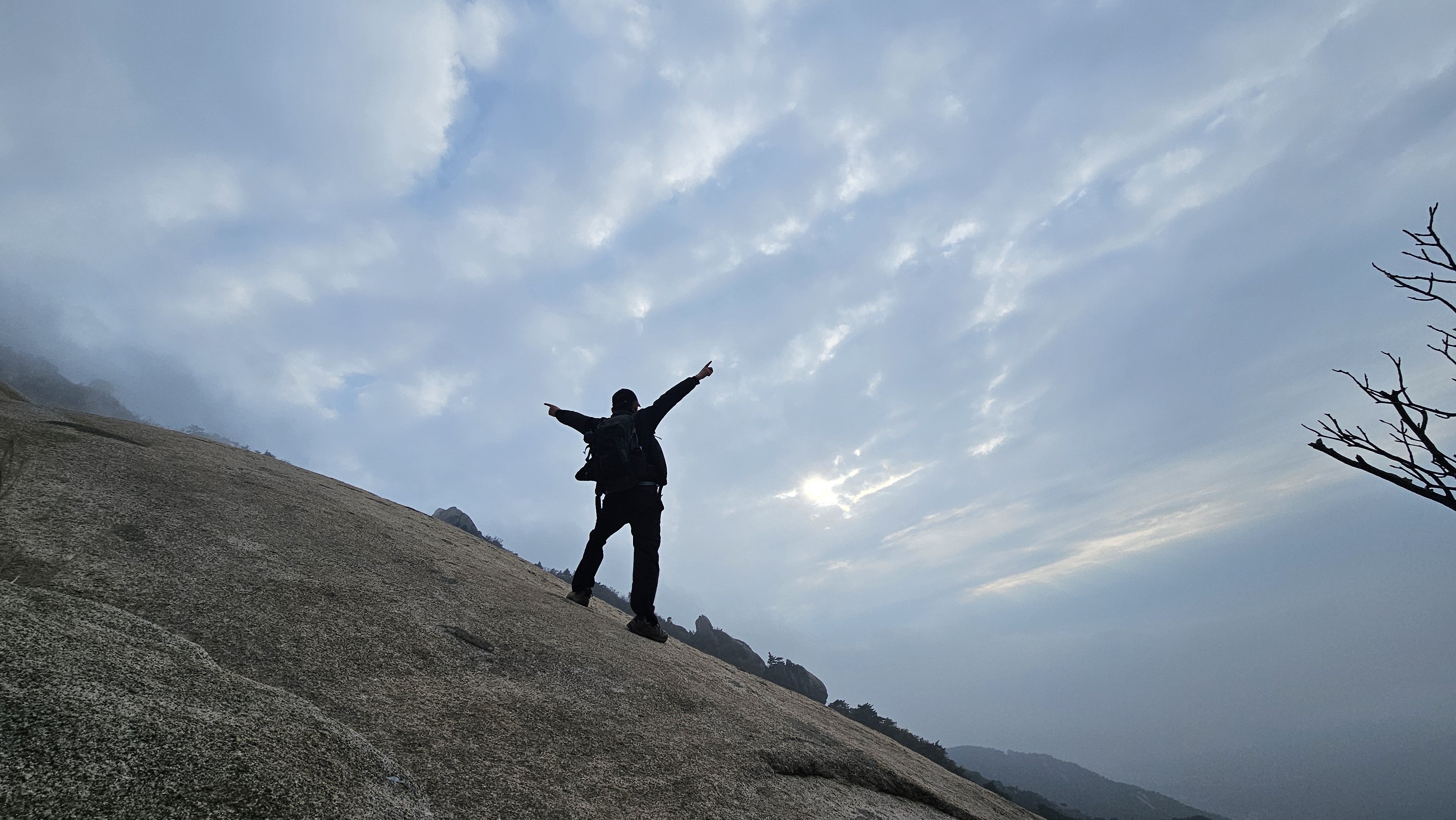 운무 사이로 햇살이 살짝 비쳐들었습니다. 그 순간, 온 산이 금빛으로 물드는 듯했지요.