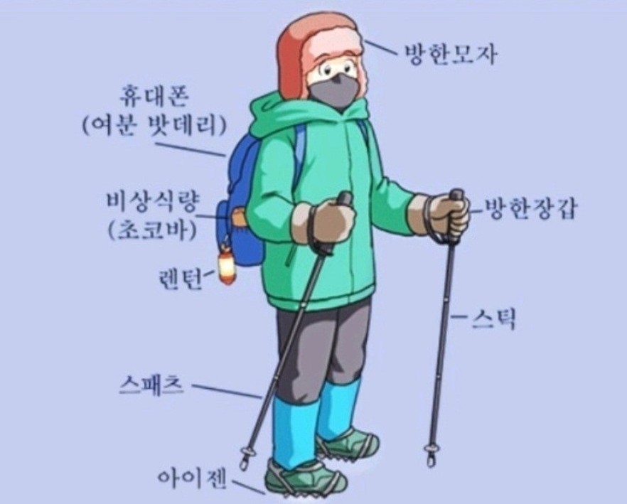 체온 유지를 위해 **핫팩과 보온병(따뜻한 물)**을 꼭 챙기세요.