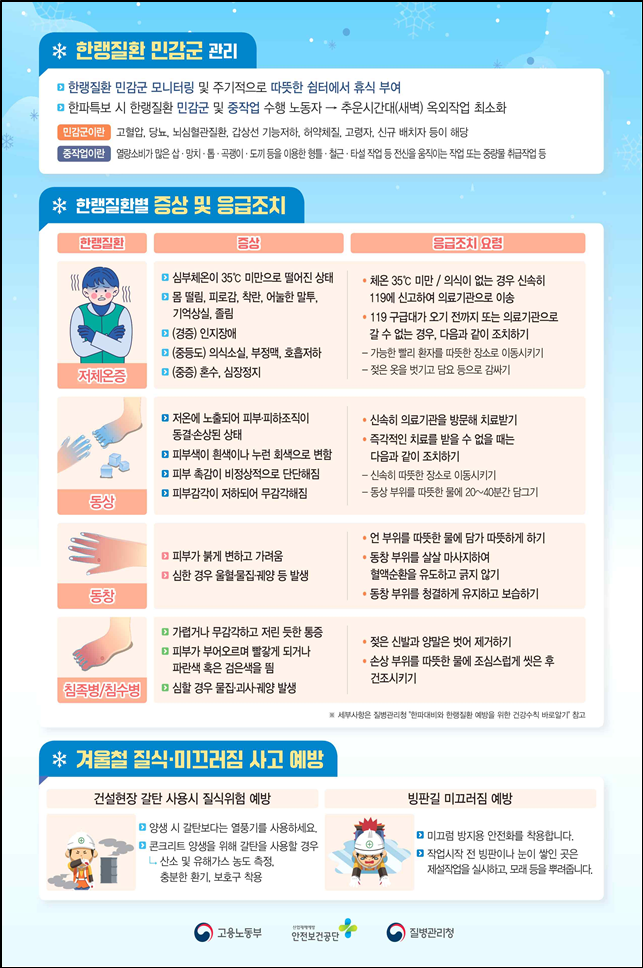 기온이 낮은 시간대 작업을 줄이고 휴식과 보온 휴게공간을 확보하는 것이 안전 대비의 핵심입니다.