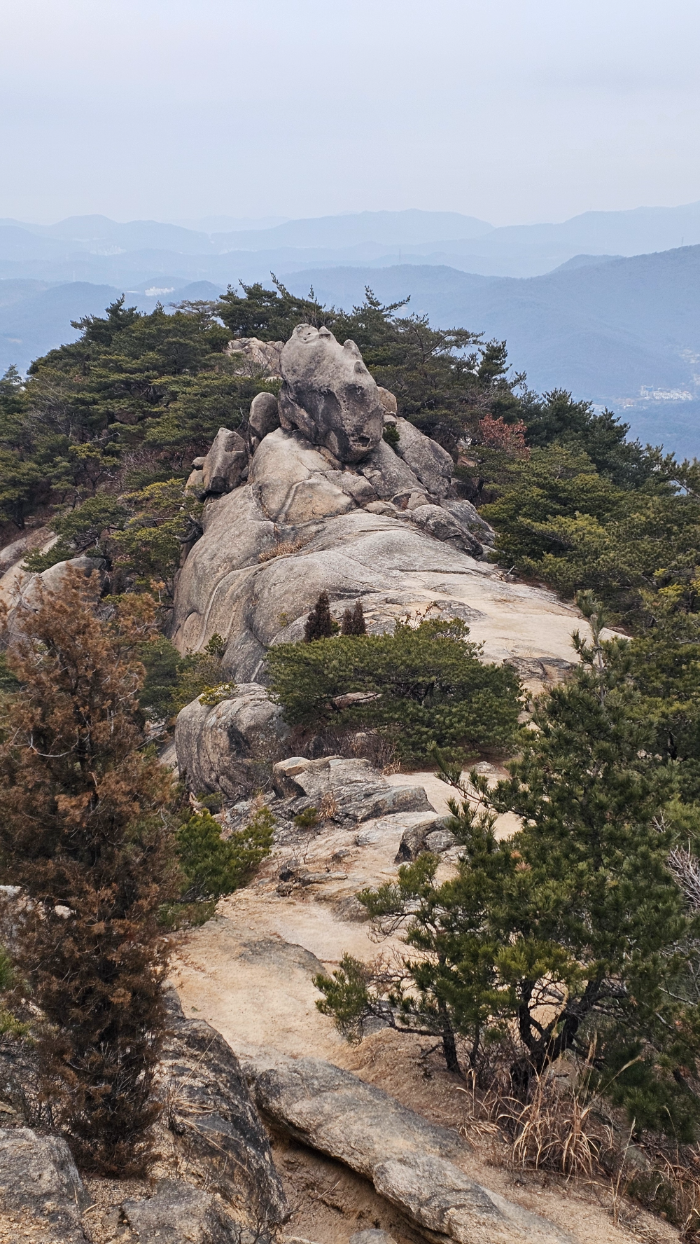 바위가 단단히 솟아 있고, 그 위로 묵직하게 얹힌 모습이